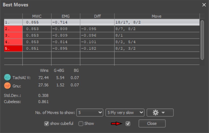 My thinking was: if I (I’m orange) do not split and play 8/2 8/7 or so, in all likelihood I will get a single direct hit afterwards. So in 10 out of 36 cases I will probably win after hitting. If I split the two checkers, the probability of getting hit with a 63 or 54 is only 4/36, while the probability to hit green is about twice as high – 20 out of 36, so the risk is worth it, particularly as I’m behind in the race.